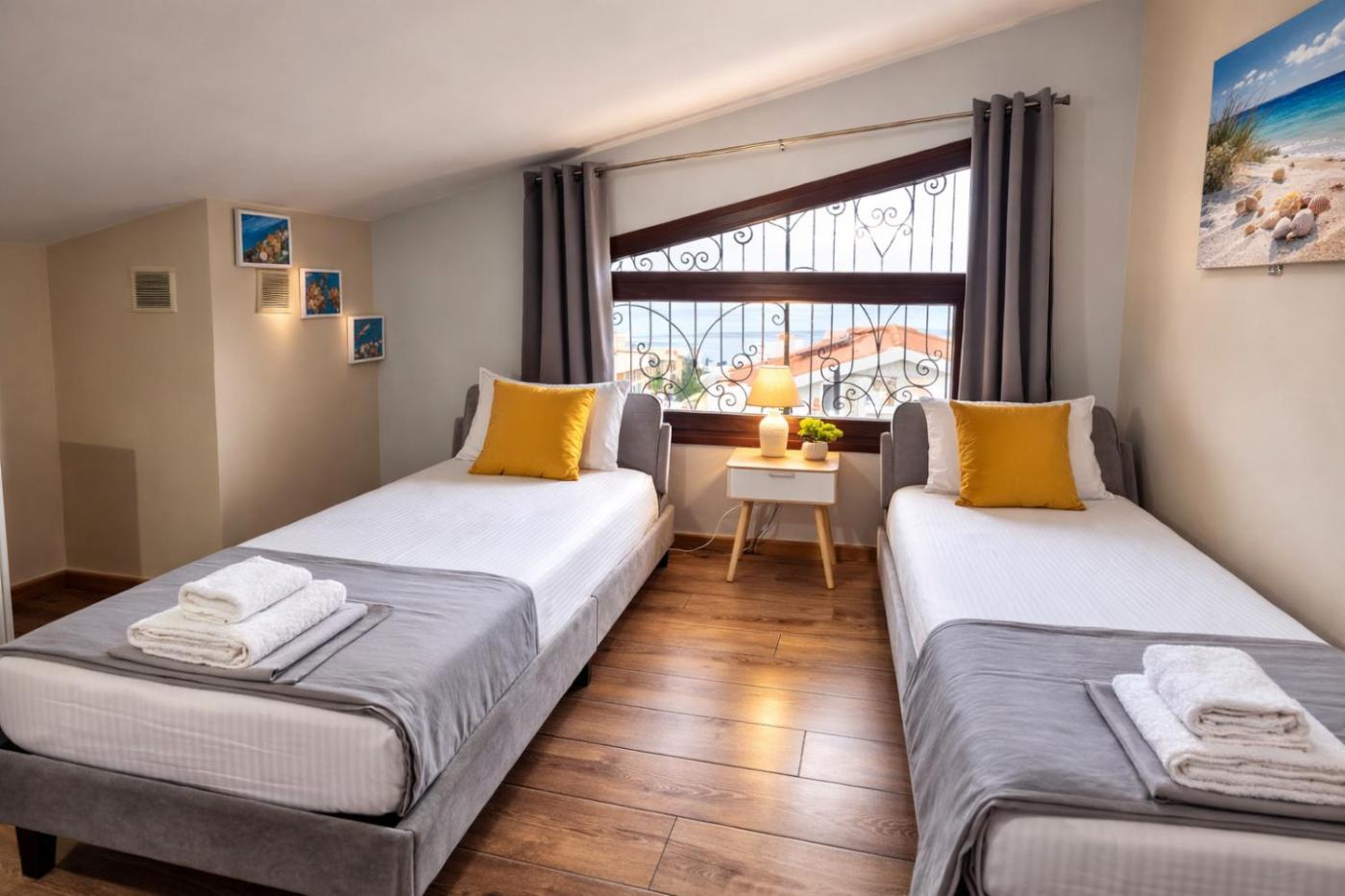 The spacious apartment features 4 bedrooms, 2 bathrooms, bed linen, towels, a flat-screen TV with streaming services, a dining area, a fully equipped kitchen, and a balcony with sea views. A private entrance leads gueststhe apartment,they can enjoy some wine or champagne and fruits. There is also a seating area and a fireplace.