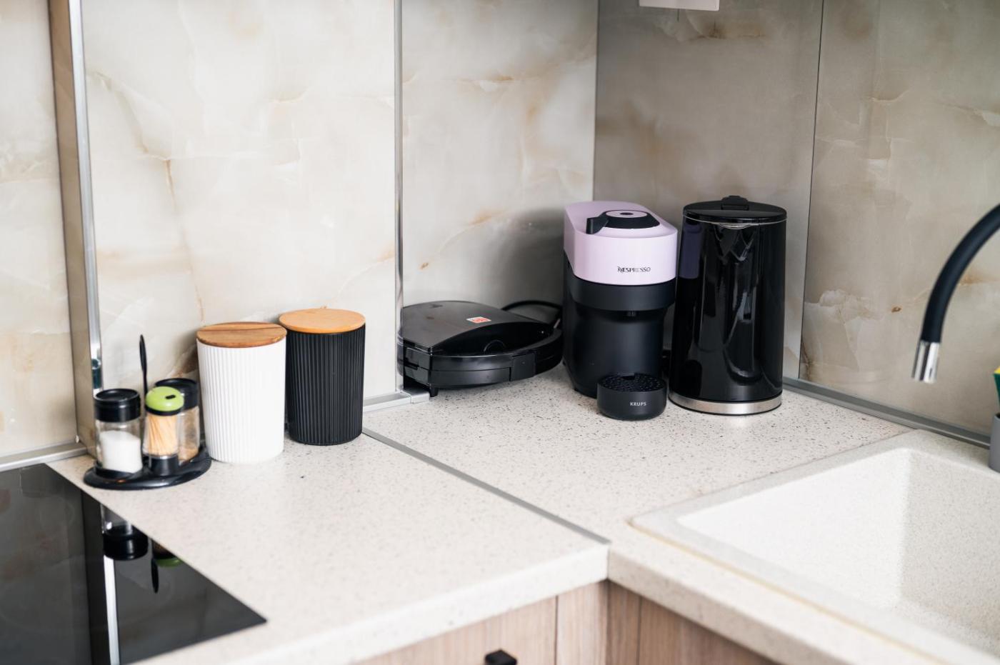 One-Bedroom Apartment. The well-fitted kitchen features a stovetop, a refrigerator, kitchenware and an oven. The air-conditioned apartment provides a flat-screen TV, a washing machine, a private entrance, a tea and coffee maker as well as city views. The unit offers 1 bed.