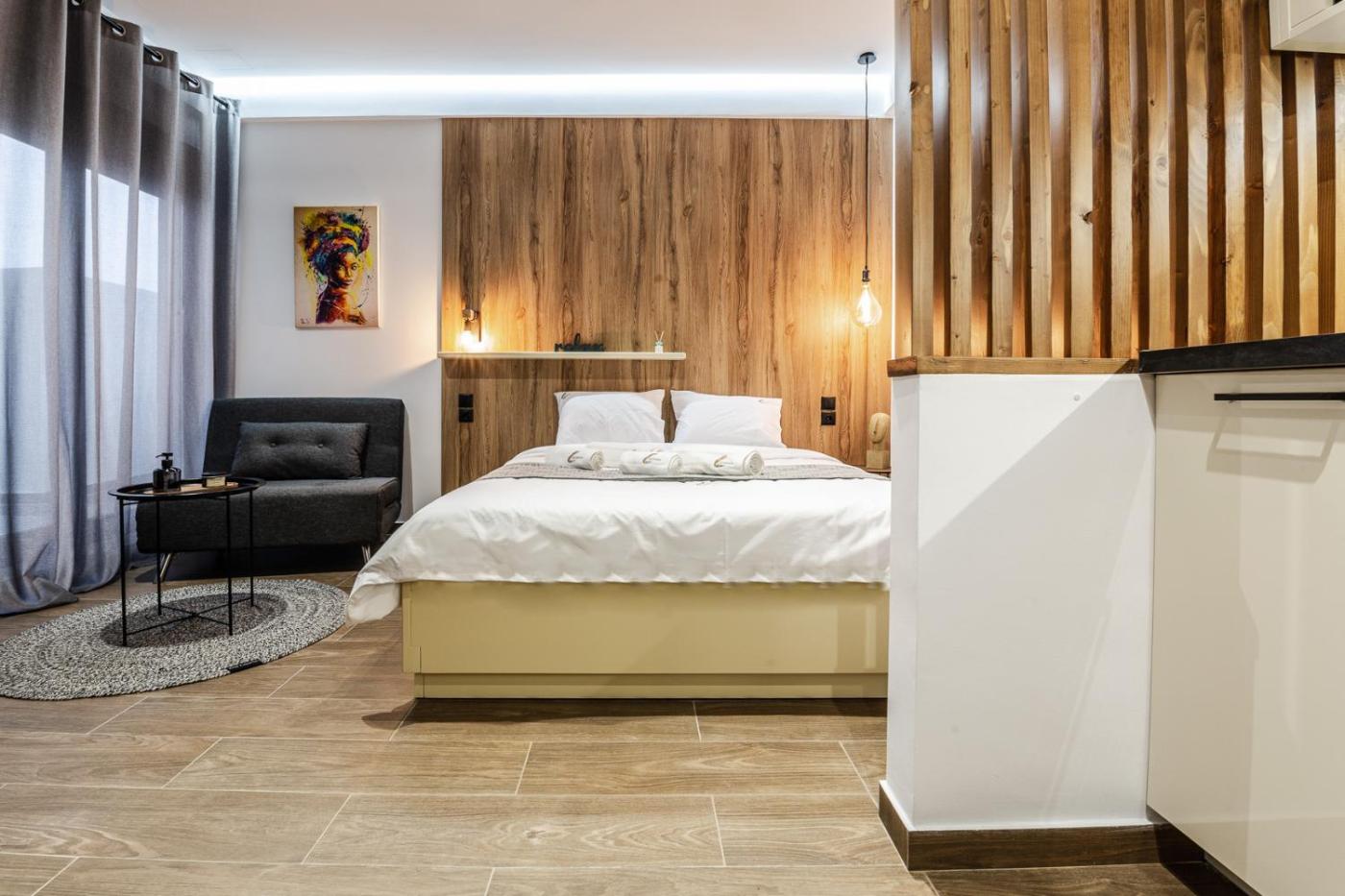One-Bedroom Apartment. This apartment features 1 living room, 1 separate bedroom and 1 bathroom with a walk-in shower and free toiletries. The fully equipped kitchen has a stovetop, a refrigerator, kitchenware and an oven. The air-conditioned apartment features a flat-screen TV, soundproof walls, a tea and coffee maker, a wardrobe as well as mountain views. The unit has 2 beds.